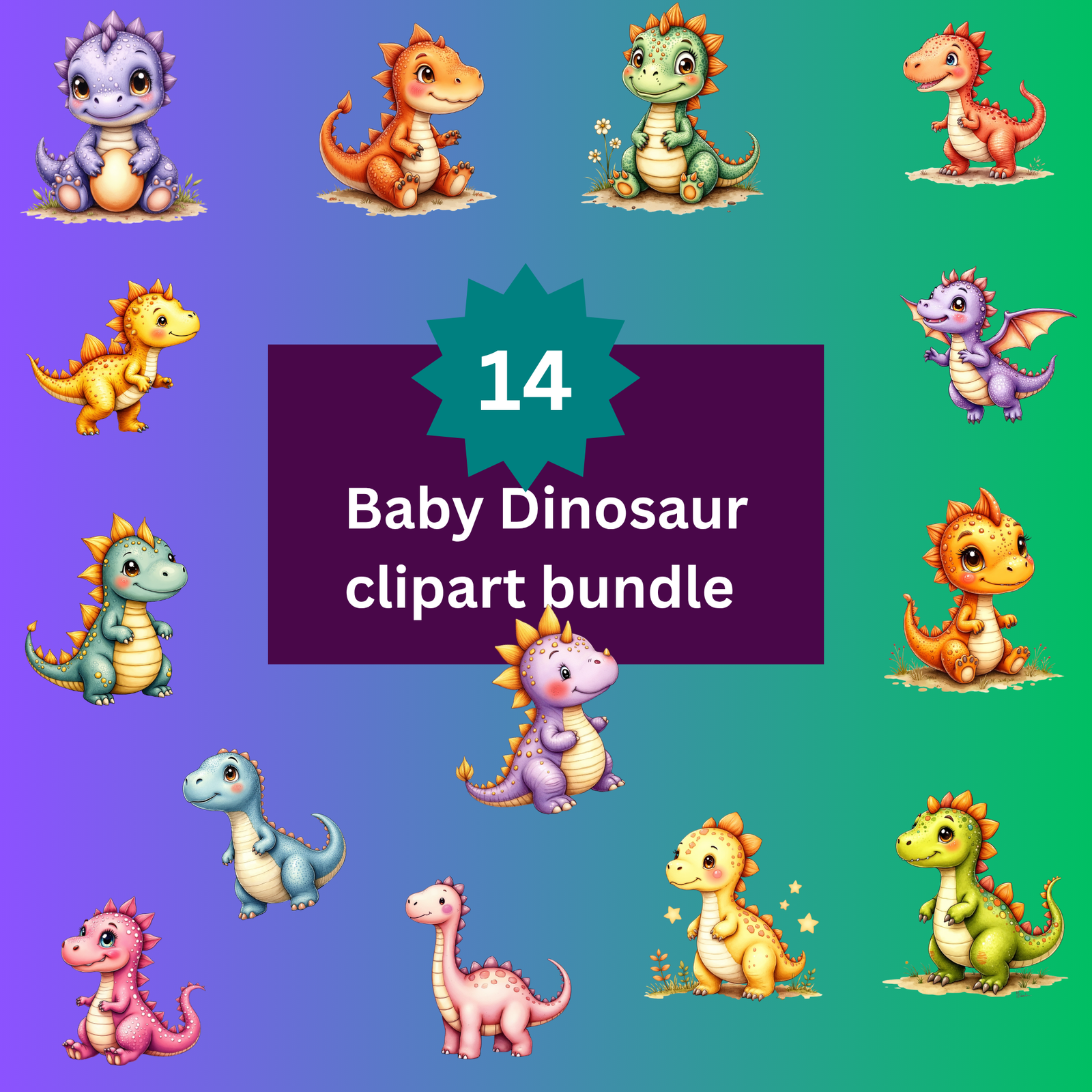 Bring adorable prehistoric charm to your designs with this sweet bundle of baby dinosaur illustrations. Each dino is full of character, featuring soft color palettes and gentle expressions – perfect for baby shower decor, kids’ birthday invitations, nursery prints, stickers, or digital scrapbooking kits.