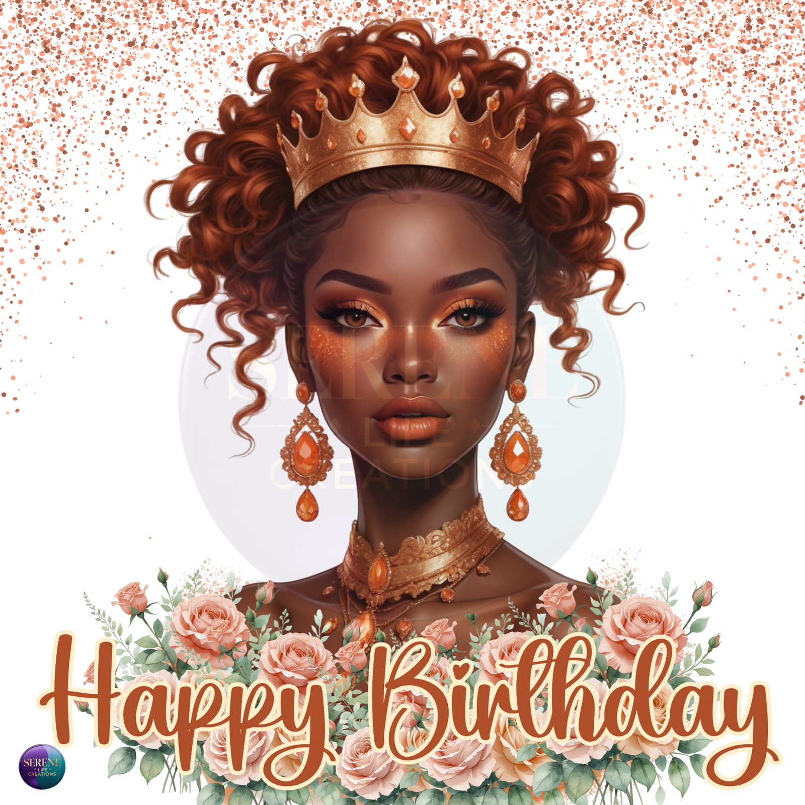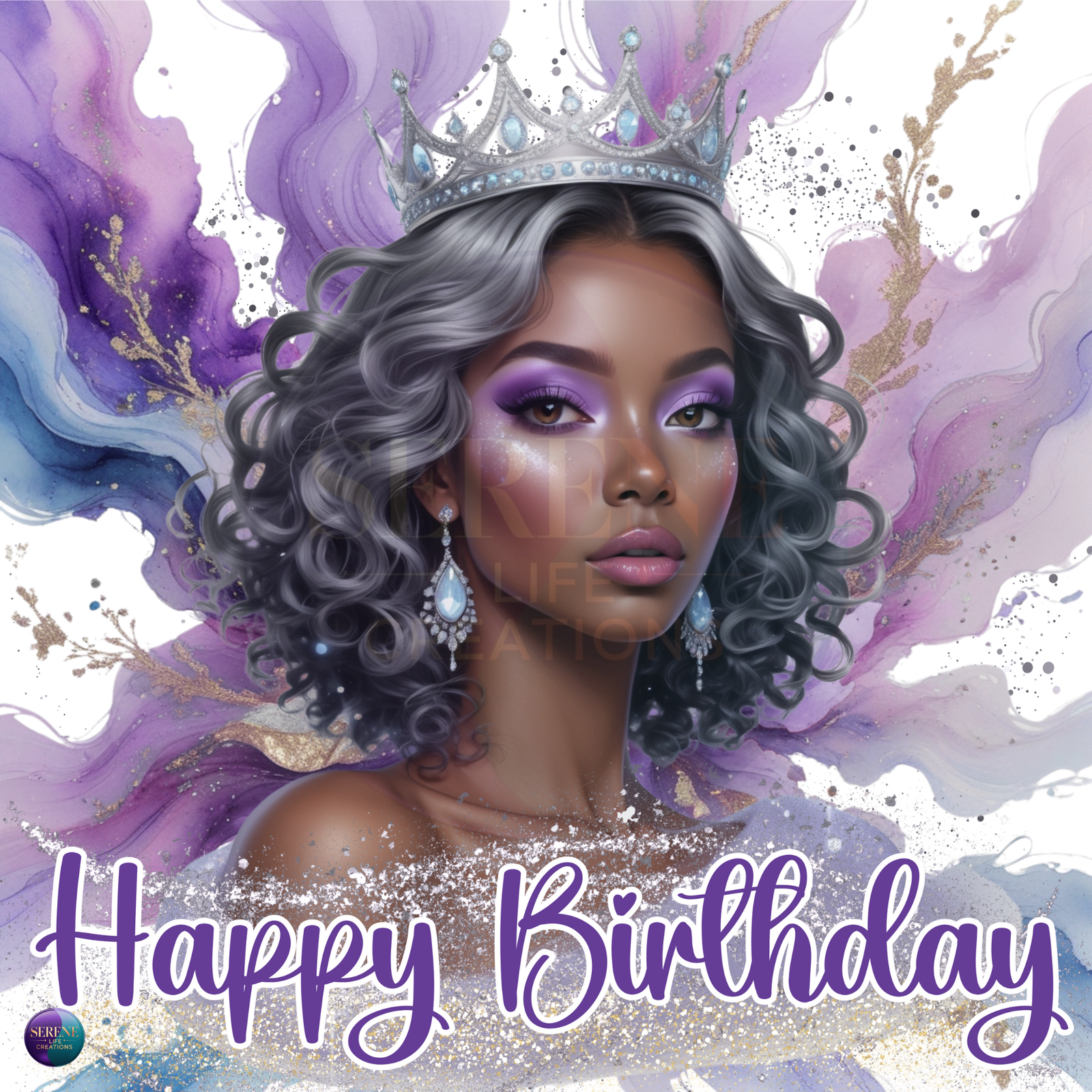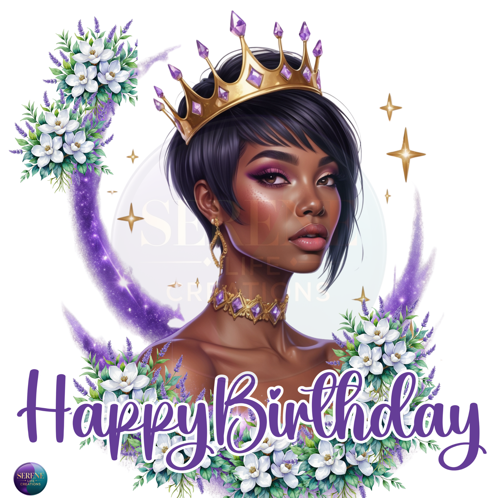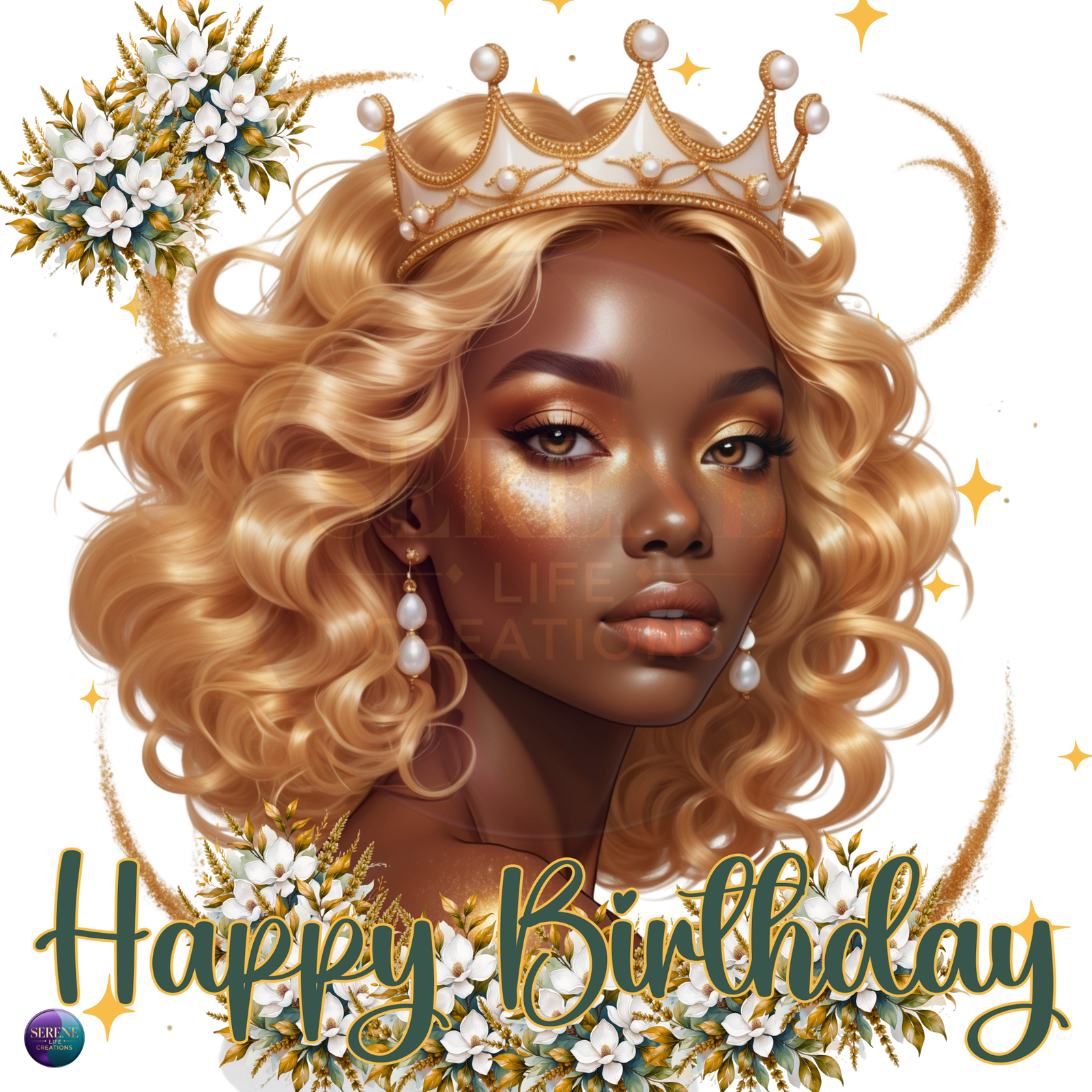 Celebrate in style with this luxe set of 12 birthday-themed cliparts featuring elegant Black women wearing crowns and glowing with queen energy. Each illustration is adorned with “Happy Birthday” text in a unique font and color palette, making them perfect for everything from party invites to shirts, mugs, journals, and digital products.