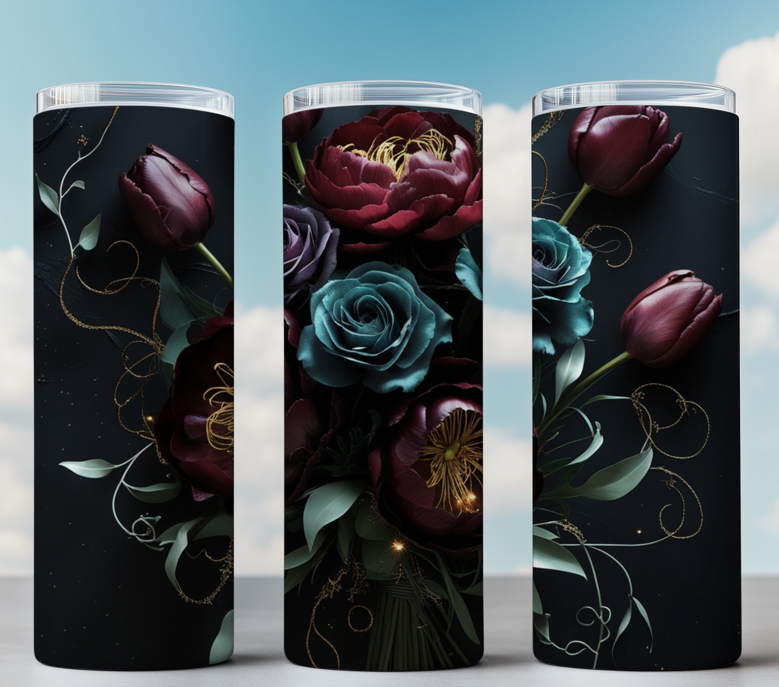 Make a statement with this rich floral wrap featuring burgundy tulips, teal roses, and lush greenery, all set against a deep matte black background. Elegant gold swirls and glowing floral details add a touch of fantasy and luxury. This high-resolution PNG is perfect for creating custom 20oz tumblers that stand out in style.