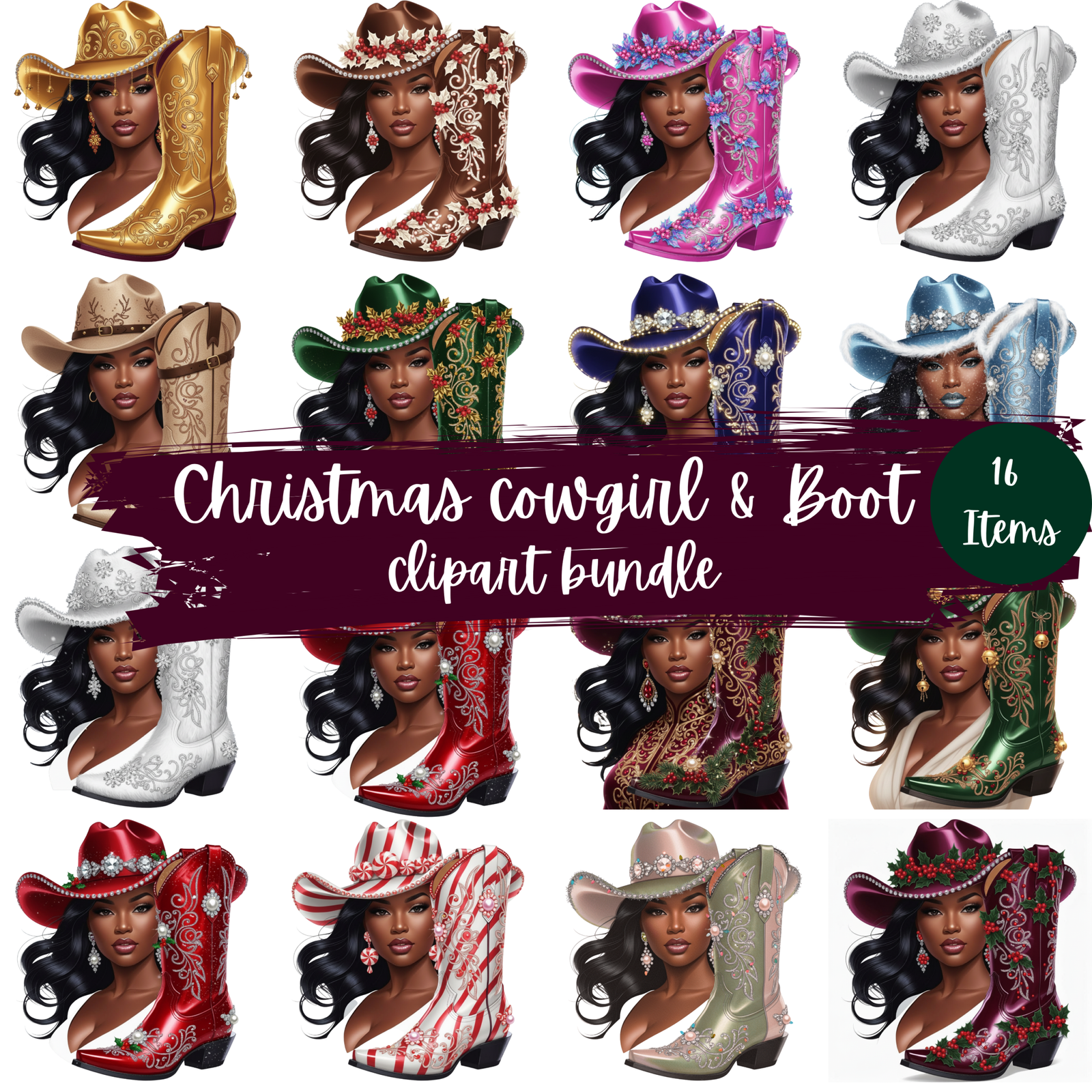 Christmas Cowgirl & Boot Clipart Bundle – 16 Festive PNGs for Western Holiday Designs