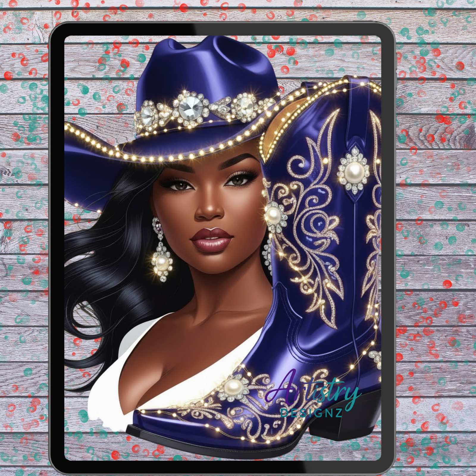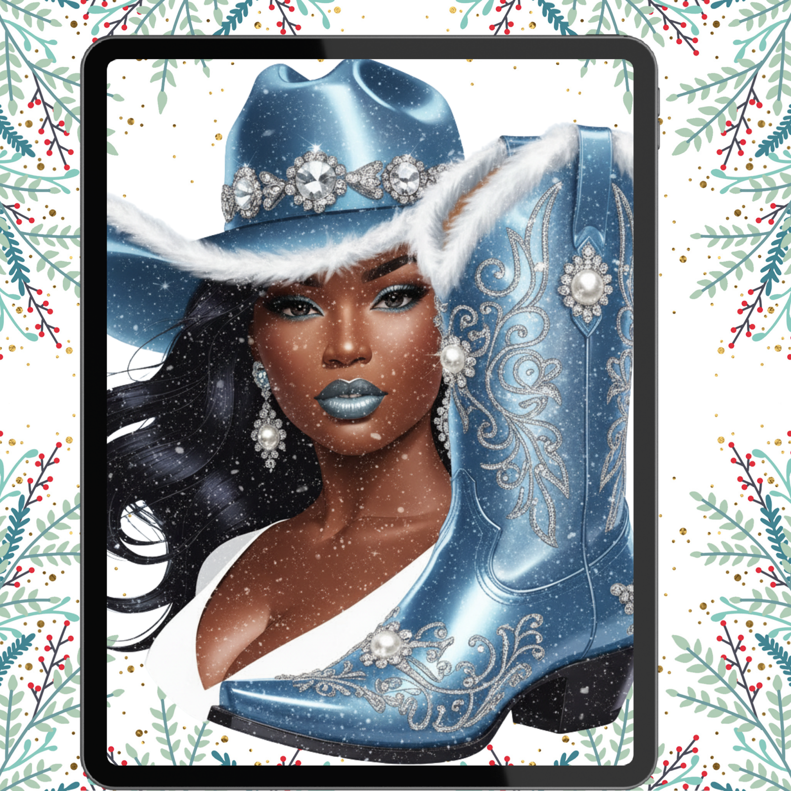 Christmas Cowgirl Clipart Bundle Black Woman Western Boot PNG is a festive and glamorous digital collection perfect for your holiday projects. This bundle includes 16 individual high-resolution PNG files featuring beautiful Black cowgirl characters paired with coordinating Western-style boots in a variety of Christmas-inspired colors and patterns. From glittery gold and icy silver to candy cane stripes and festive reds, each set exudes personality, holiday cheer, and western charm.
