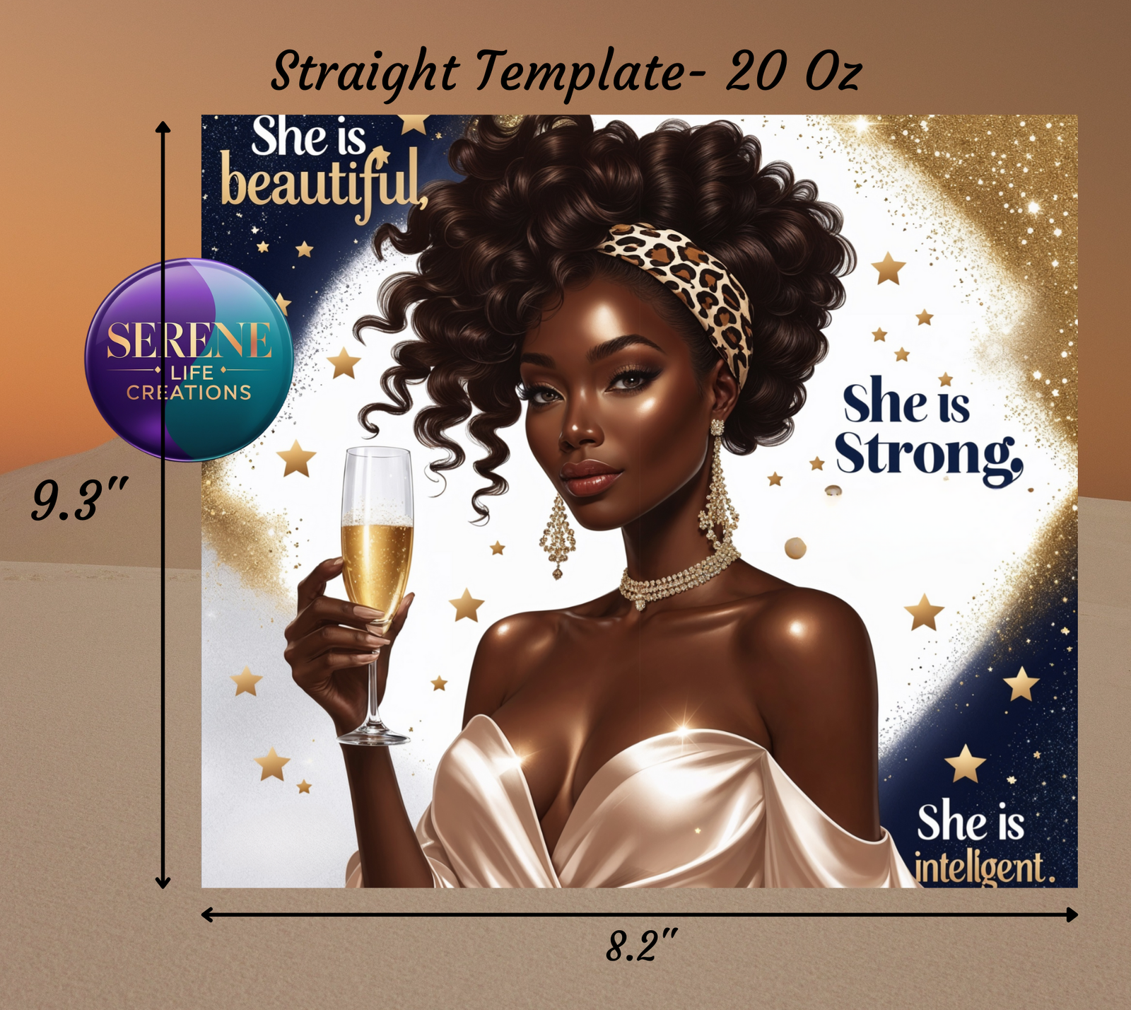Elevate your tumbler designs with this stunning 20oz tumbler wrap, featuring a confident and elegant Black woman holding a champagne glass. This high-quality PNG file showcases luxurious deep brown skin, voluminous curls adorned with a chic leopard-print headband, and a silky off-the-shoulder gown that radiates sophistication.