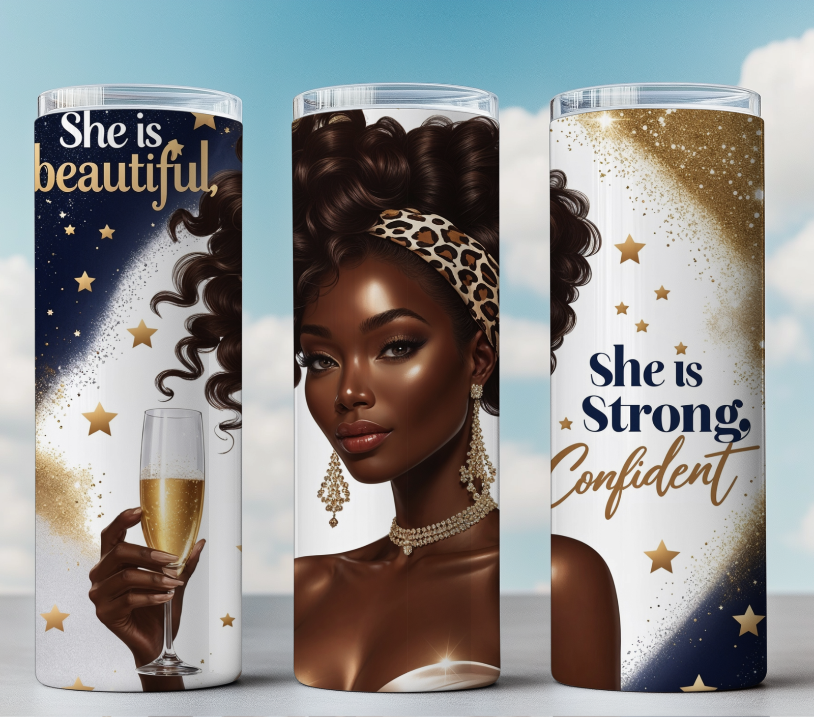 Set against a dazzling gold and navy-blue gradient background, this design is accented with shimmering golden stars and empowering affirmations like She is Beautiful, She is Strong, She is Intelligent. Perfect for celebrating self-love, empowerment, and feminine strength.