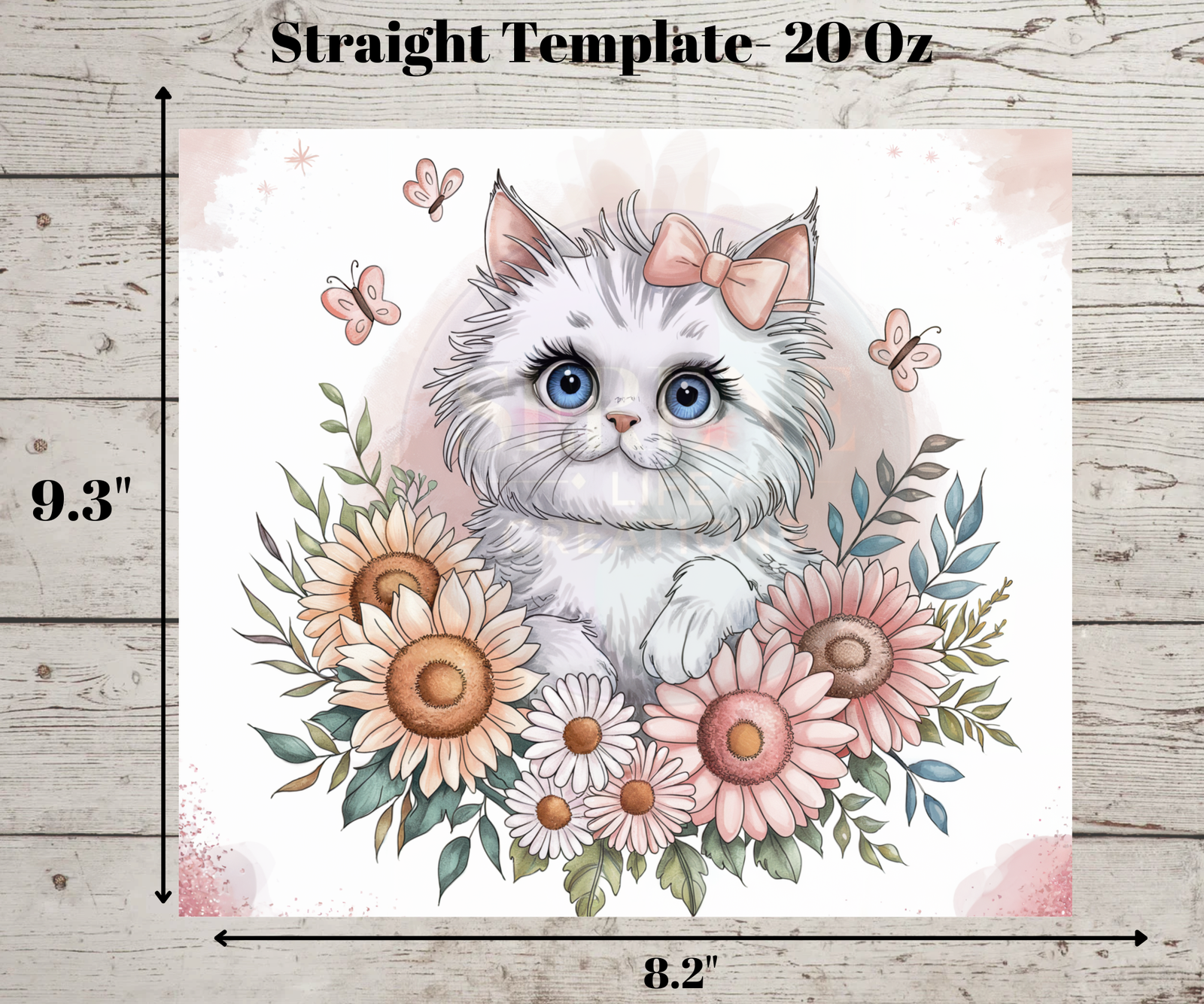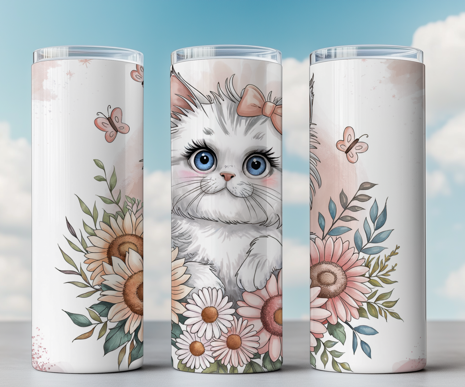 This floral kitten tumbler wrap features an adorable hand-drawn white kitten with big blue eyes, soft pink floral accents, and a delicate boho aesthetic. Designed for a charming and elegant farmhouse or cottagecore vibe, this digital downloadis perfect for sublimation on 20oz skinny tumblers. Whether for personal use or selling finished tumblers, this design is ideal for cat lovers and those who adore soft, feminine styles.