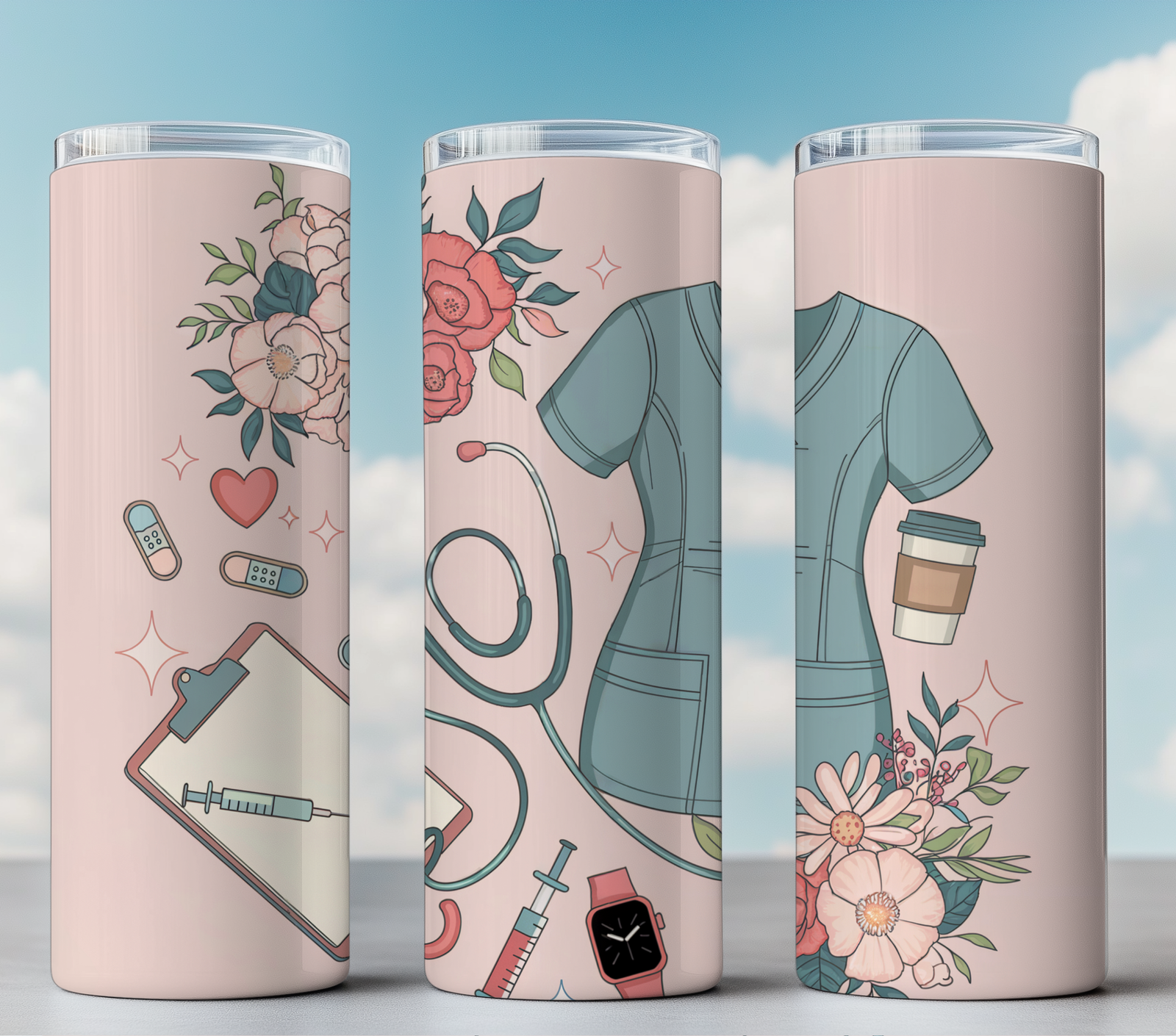 Nurse-themed 20oz tumbler wrap with floral and medical elements. Instant digital download in high-resolution PNG for sublimation printing