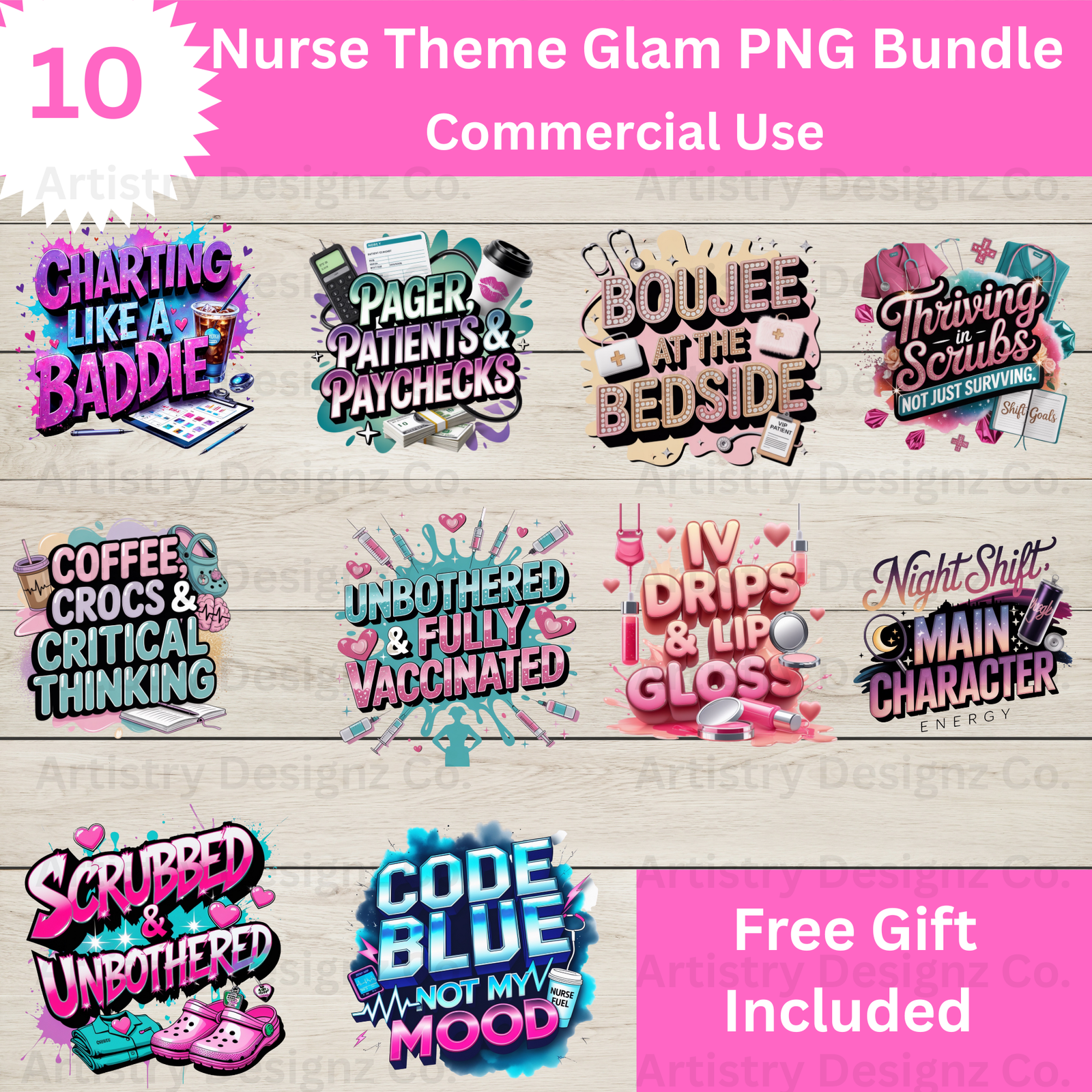 Introducing the ultimate Glam Nurse PNG Bundle – a bold, stylish collection of digital graphics designed specifically for nurses, medical professionals, and creators in the healthcare niche. This exclusive set features 10 high-quality sublimation-ready PNGs with powerful phrases like “Code Blue Not My Mood,” “Boujee at the Bedside,” and “Coffee, Crocs & Critical Thinking.”