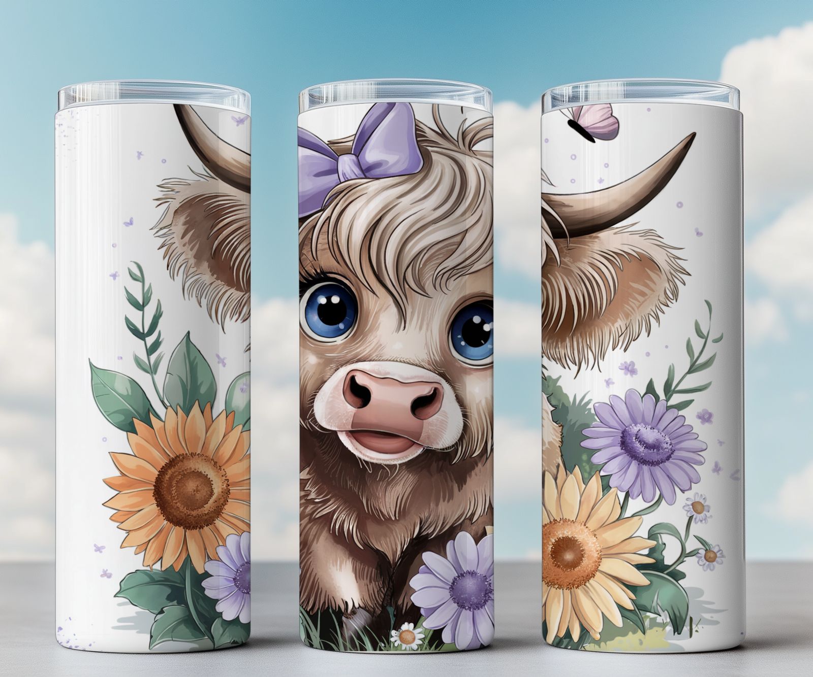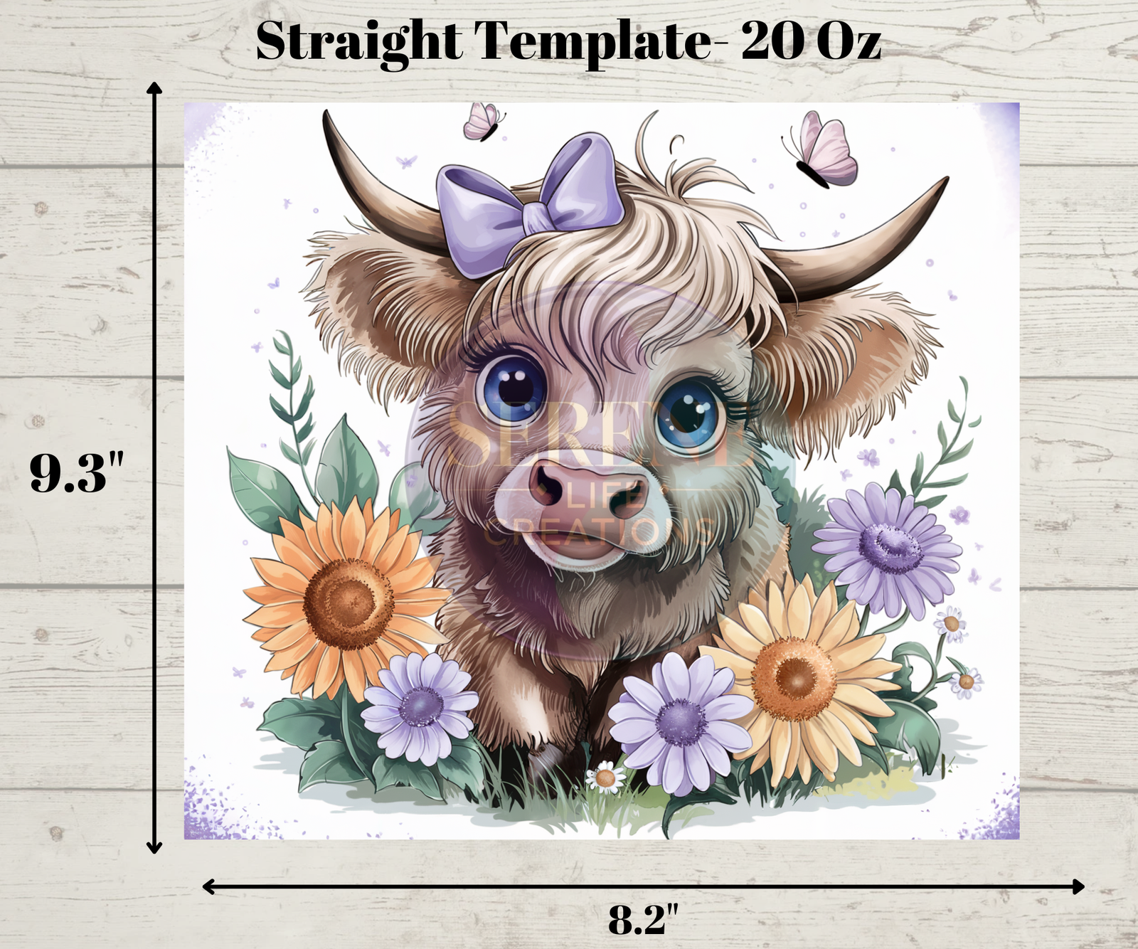 This highland cow tumbler wrap features a charming hand-drawn cow surrounded by delicate sunflowers, lavender, and greenery. Designed for a soft farmhouse aesthetic, this digital download is perfect for sublimation on 20oz skinny tumblers. Whether creating for personal use or selling finished tumblers, this design adds a rustic and country-inspired touch to any collection.