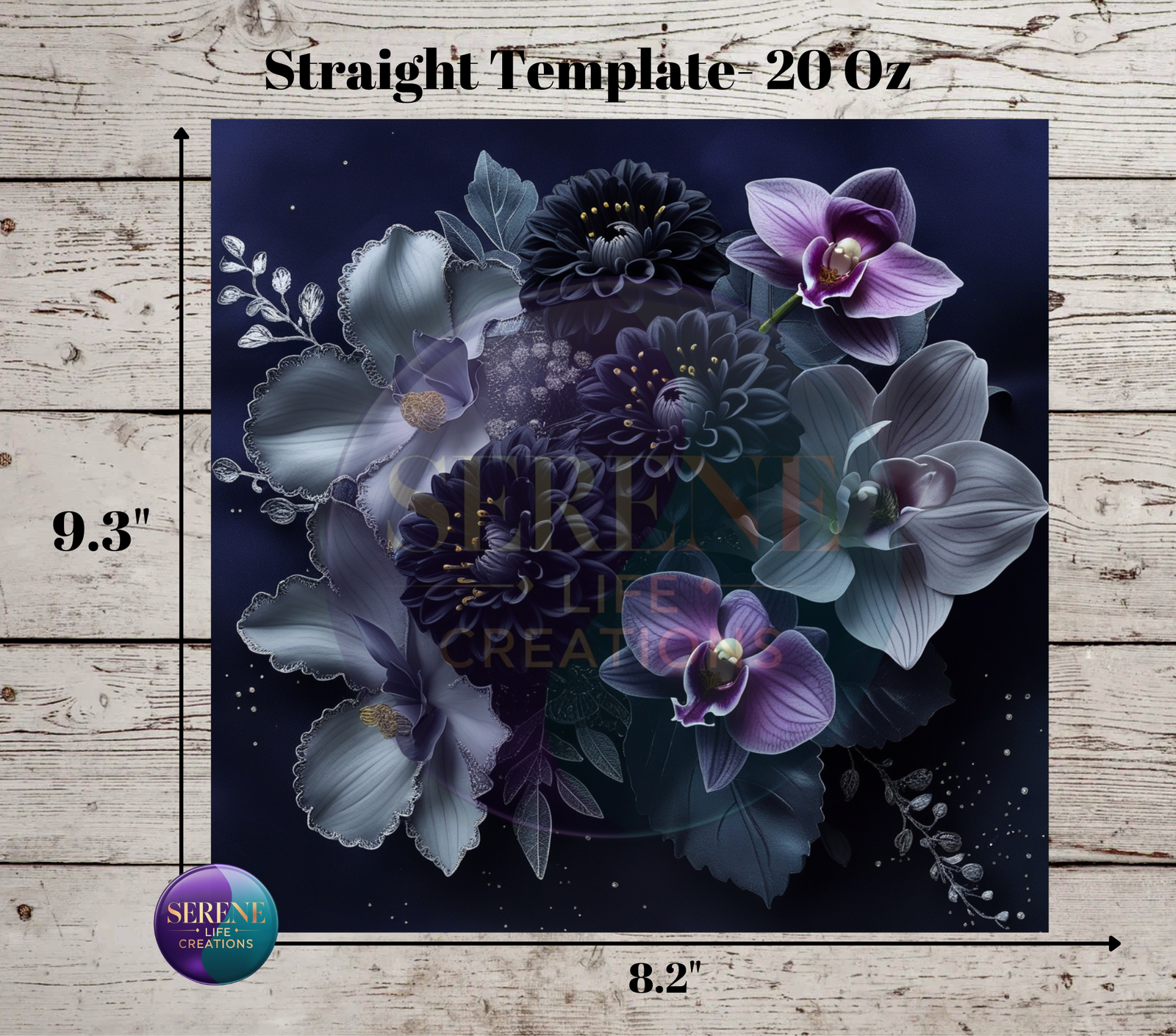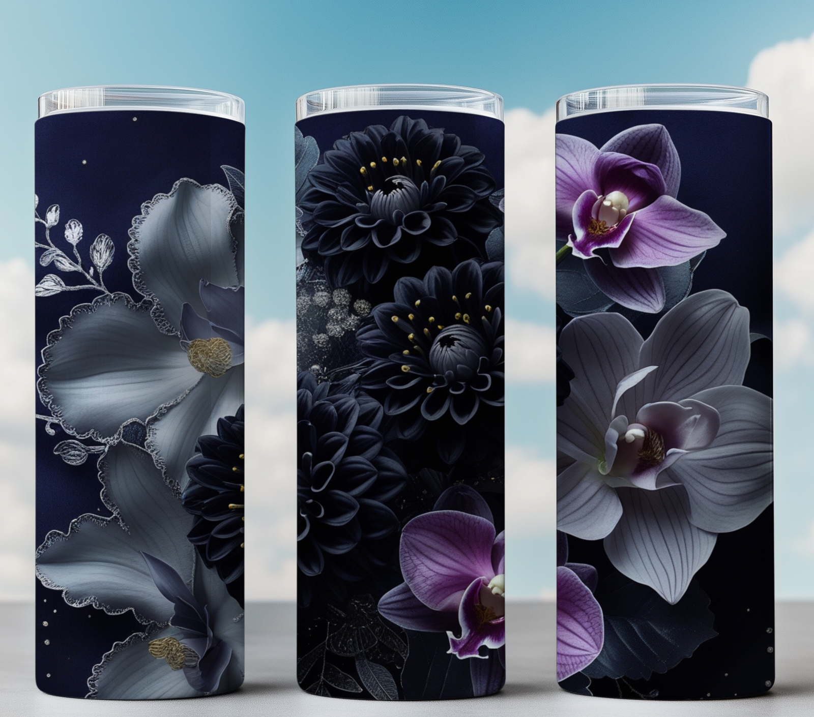 This high-resolution floral tumbler wrap features a luxe arrangement of deep black dahlias, soft silver petals, and lavender-toned orchids against a midnight background. Elegant details like metallic shimmer and soft shadows give this design a classy, moody edge — ideal for premium custom tumbler projects.