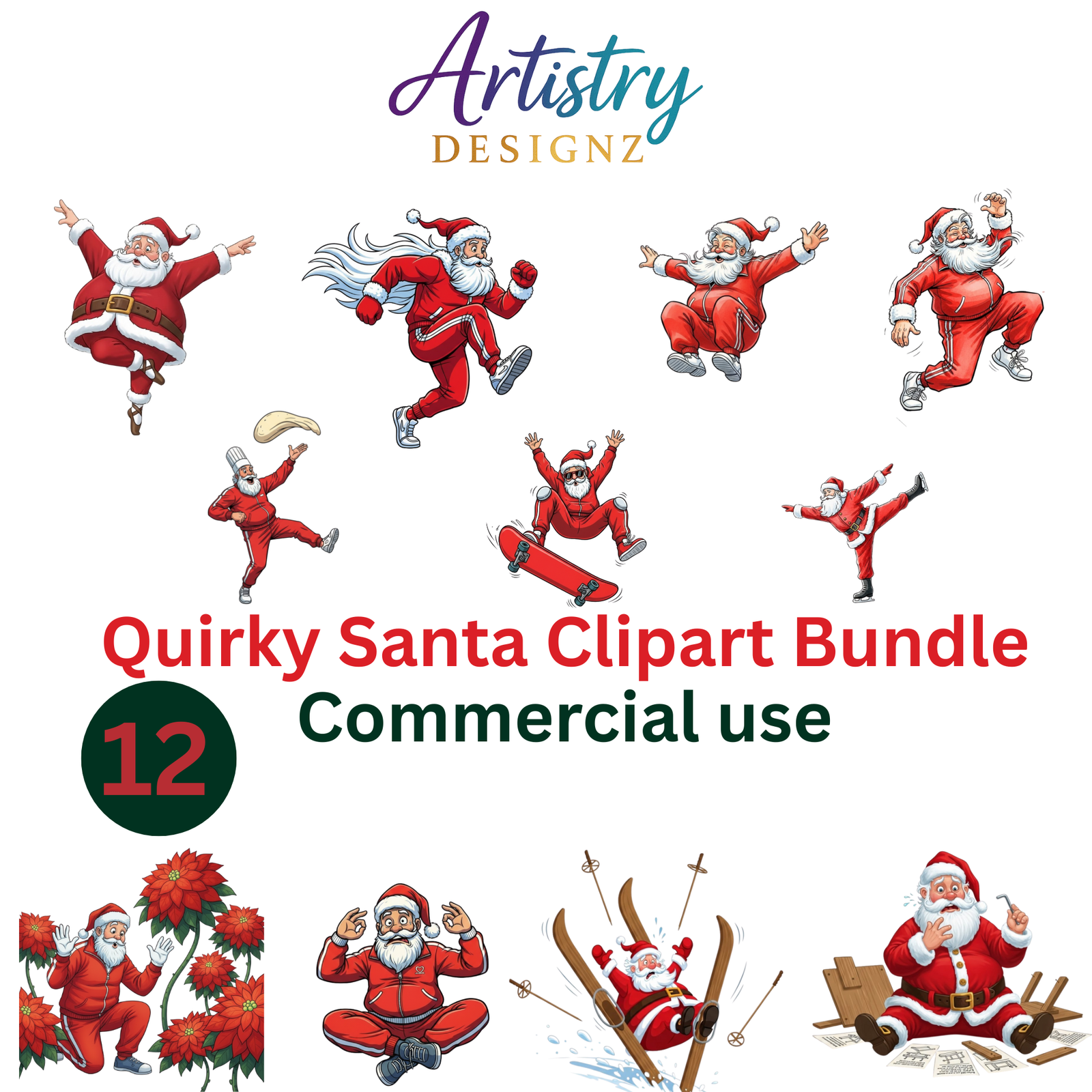 Get into the holiday spirit with this fun and whimsical Quirky Santa Clipart Bundle! Featuring 12 high-quality PNG graphics of Santa in hilarious, dynamic poses—skateboarding, skiing, meditating, baking pizza, and more—these festive illustrations are perfect for sublimation, holiday cards, digital crafts, stickers, t-shirts, mugs, and any creative Christmas project.