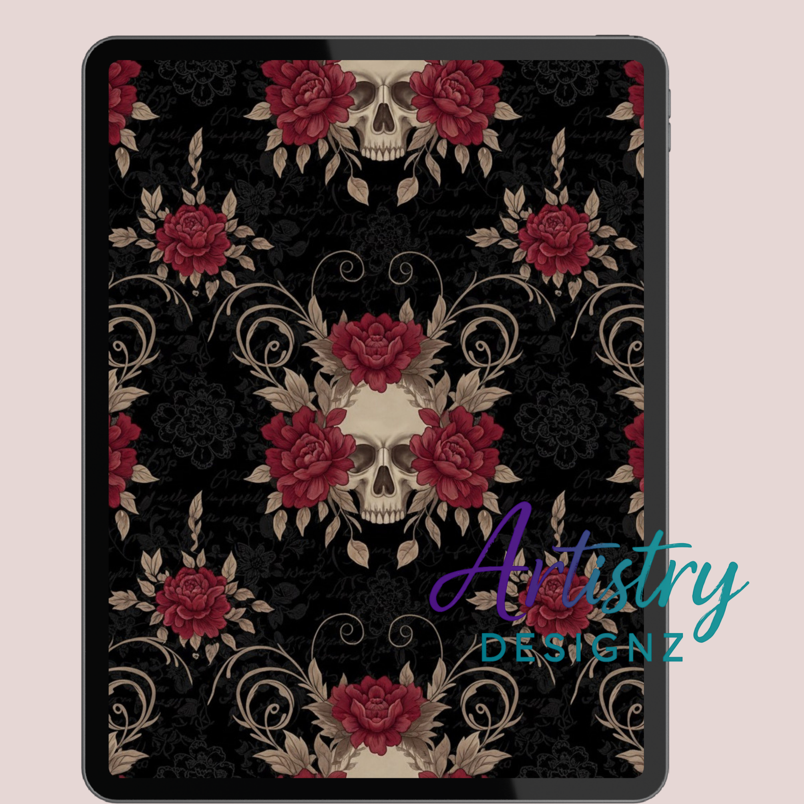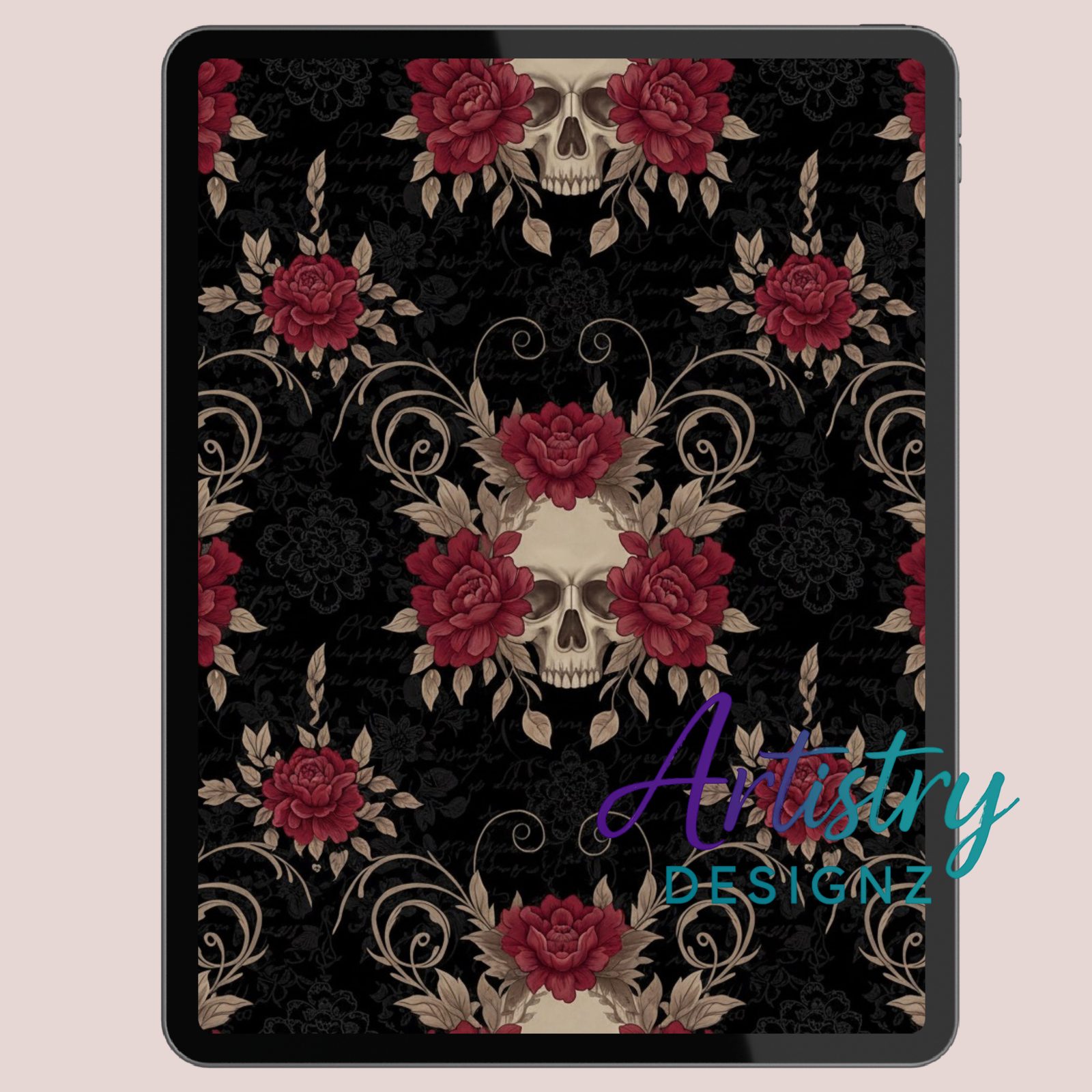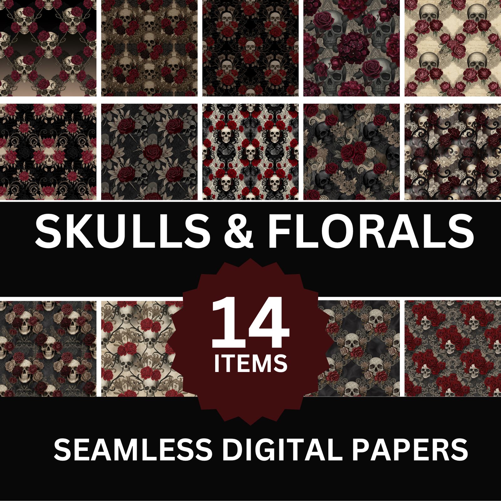 Skulls and Florals Seamless Digital Paper Pack – Gothic Skull Rose Backgrounds – 14 Dark Grunge Halloween Patterns JPG for sublimation, scrapbooking, gothic journaling, and spooky craft projects. This hauntingly beautiful set features dark red roses, distressed backgrounds, and vintage skull motifs blended into seamless patterns. Ideal for gothic aesthetics, Halloween themes, alternative party invites, or edgy product designs.