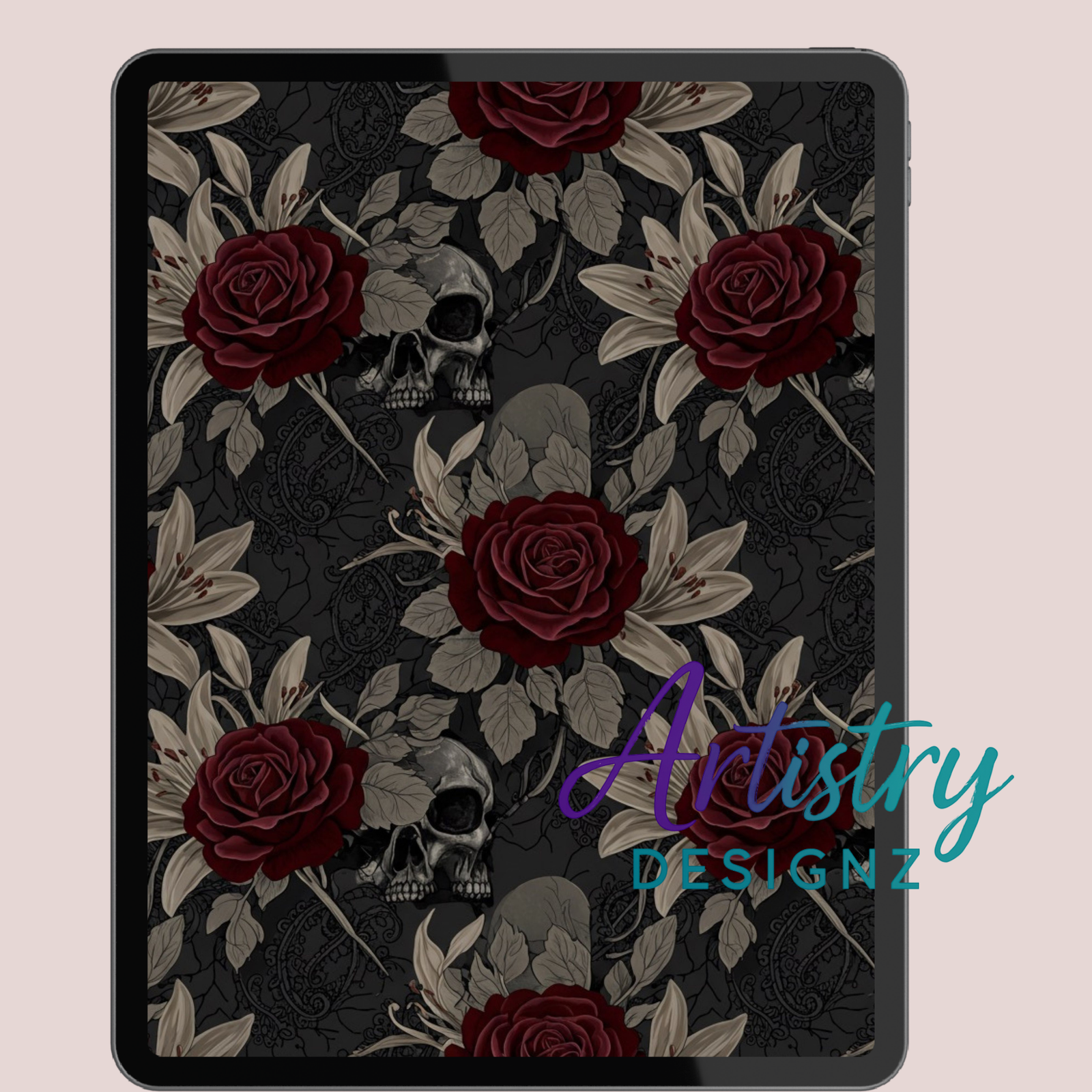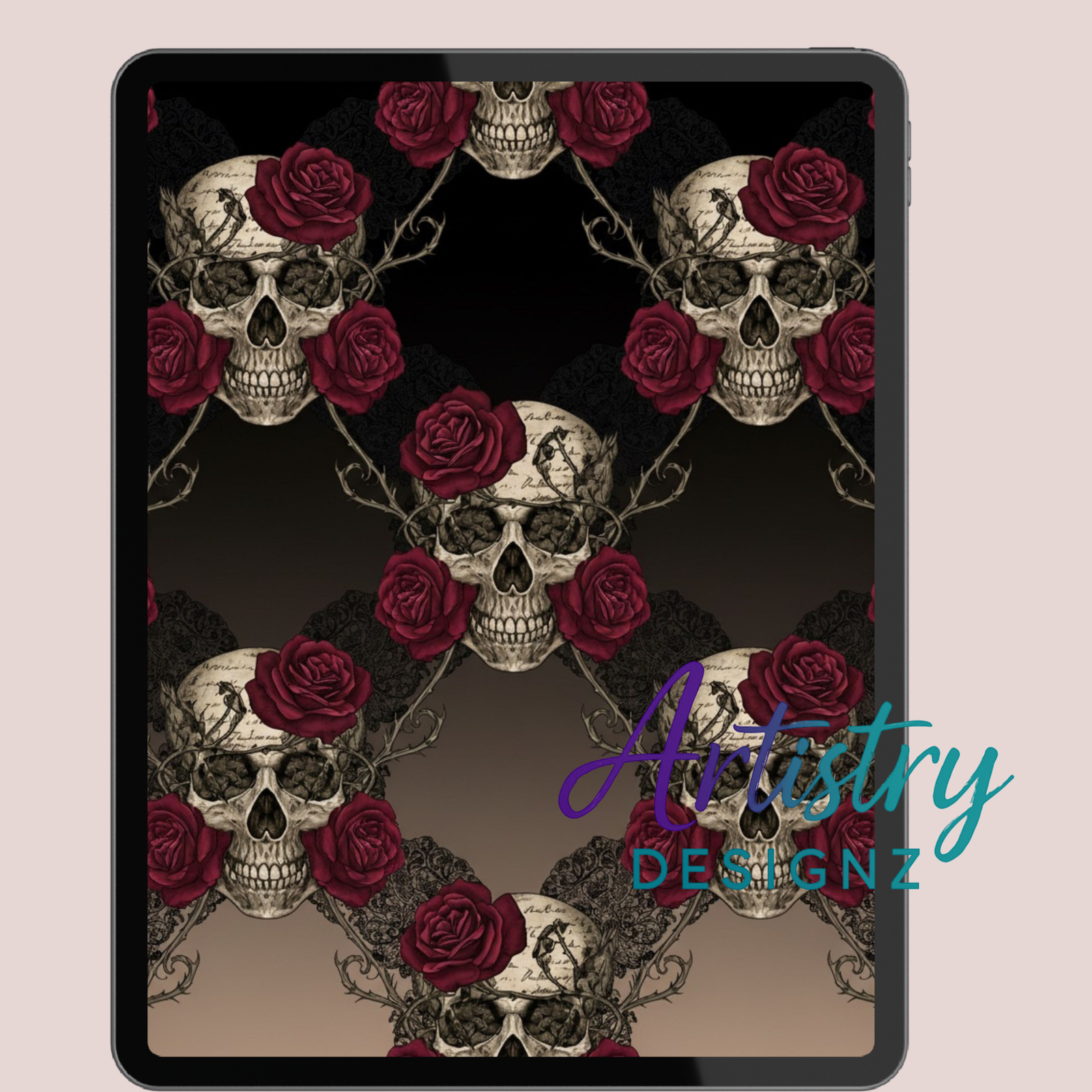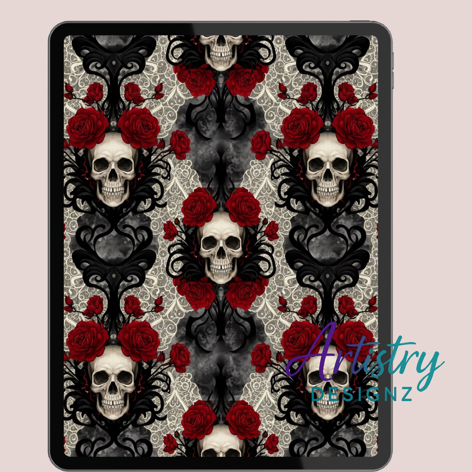 Skulls and Florals Seamless Digital Paper Pack – Gothic Skull Rose Backgrounds – 14 Dark Grunge Halloween Patterns JPG for sublimation, scrapbooking, gothic journaling, and spooky craft projects. This hauntingly beautiful set features dark red roses, distressed backgrounds, and vintage skull motifs blended into seamless patterns. Ideal for gothic aesthetics, Halloween themes, alternative party invites, or edgy product designs.