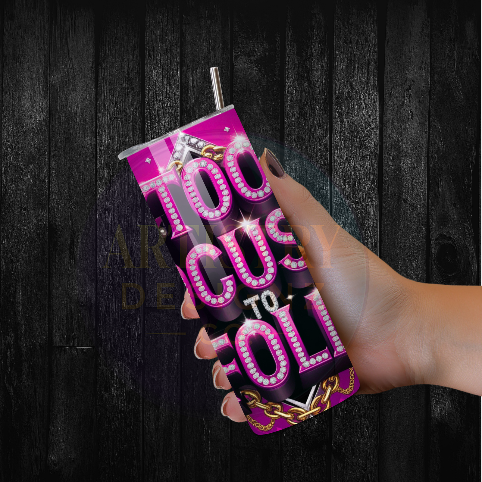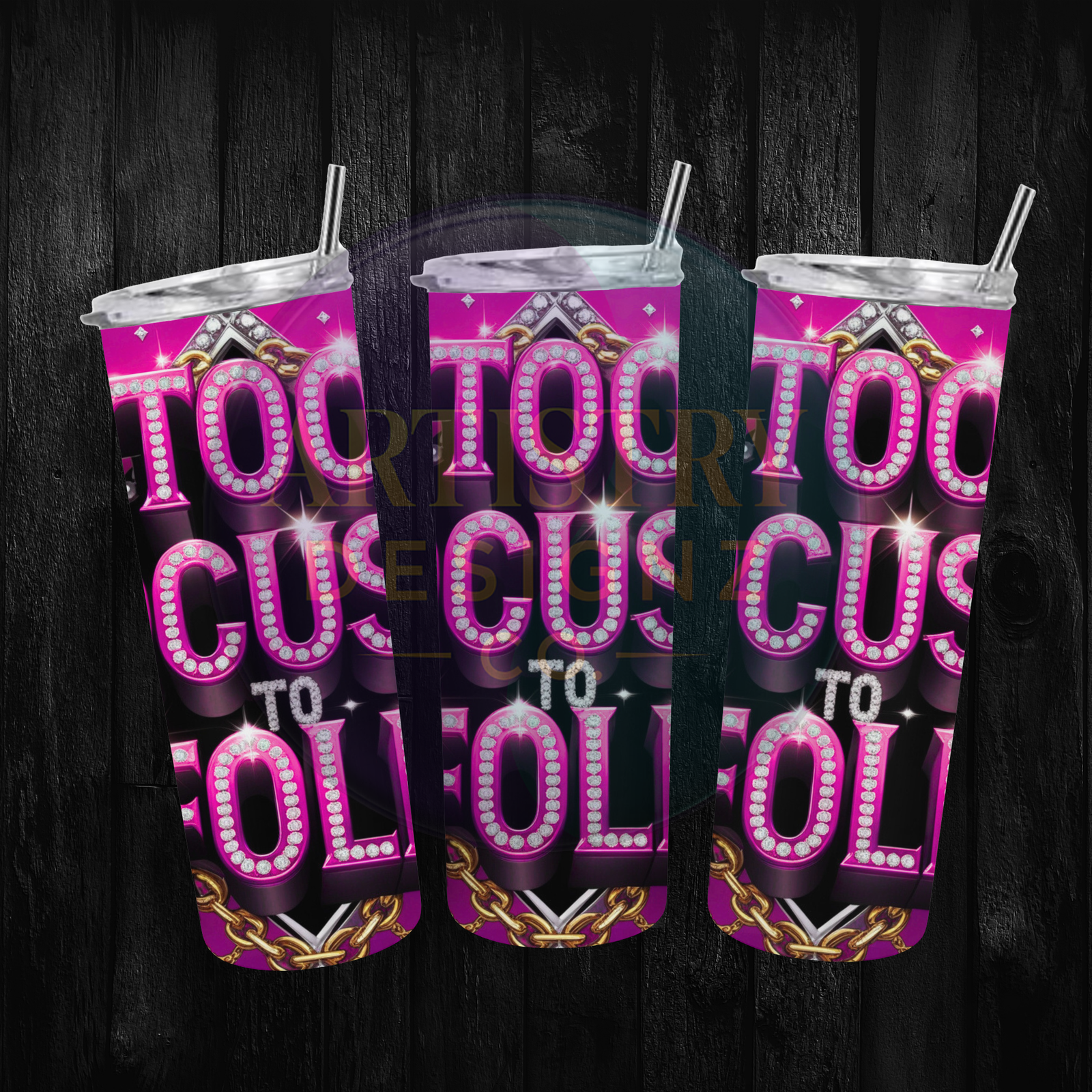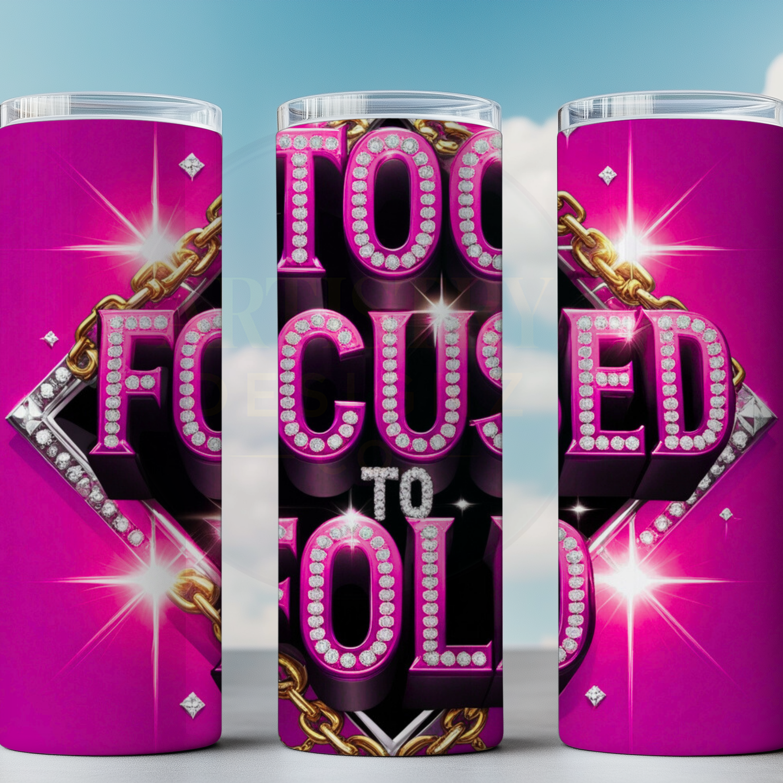 Glam 20oz tumbler wrap PNG with “Too Focused to Fold” rhinestone and chain design. Perfect for sublimation and boss babe gifts.